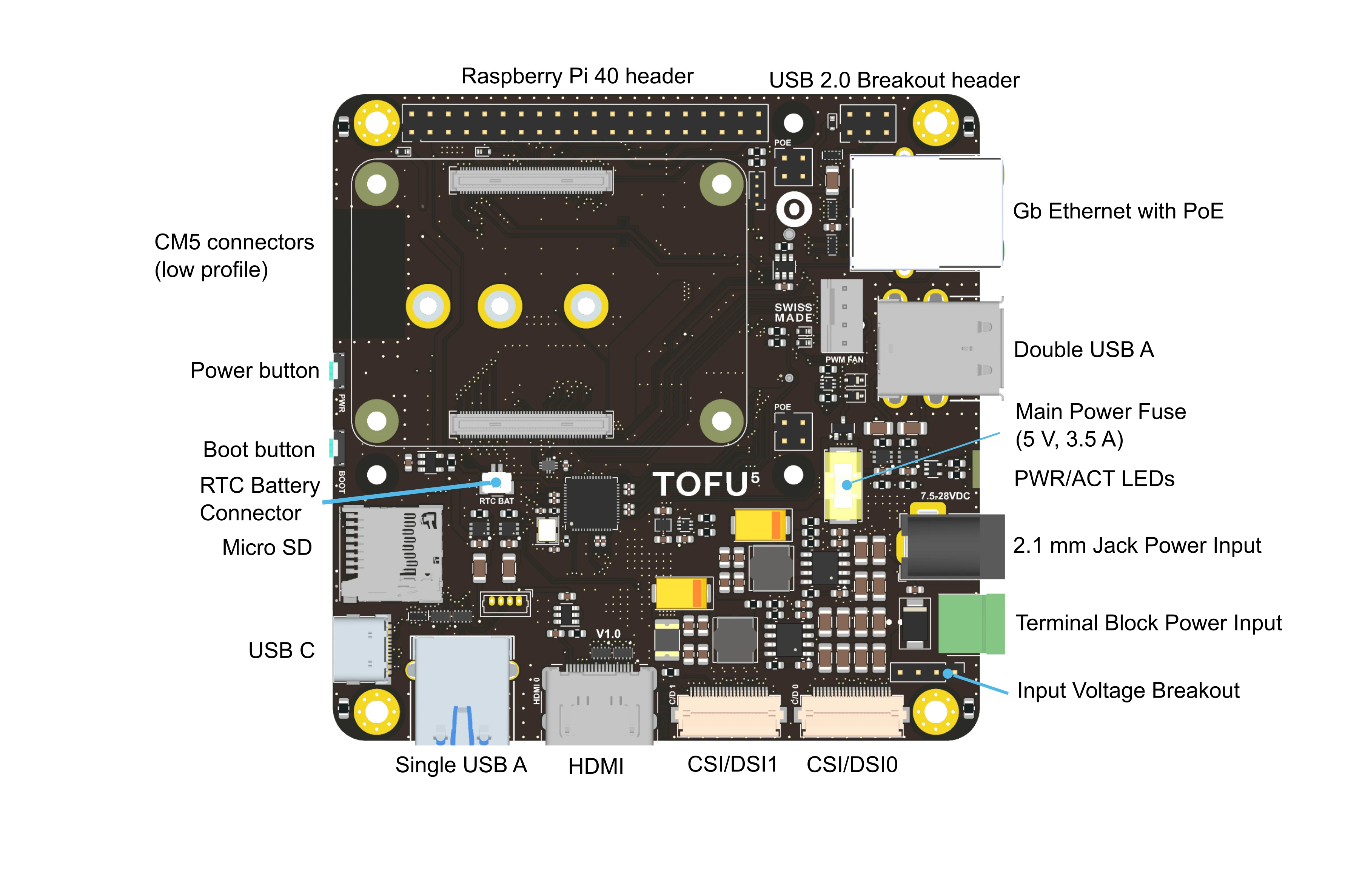 With upgraded support for displays, cameras, and faster USB 3.0 ports when paired with the latest CM5, the TOFU5 enables seamless upgrades and new possibilities for your TOFU solutions across a variety of use cases.